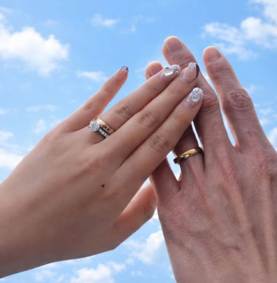 投稿には、妻と並んで空に手を掲げる写真が添えられ、左手薬指には指輪が確認できました。