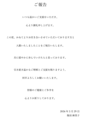 2026年3月29日、篠田麻里子さんは自身のInstagramで再婚を公表しました。 再婚相手は株式会社ナレッジワークの創業者兼CEO・麻野耕司氏であることを明かし、「共に穏やかに歩んでいけたらと思っています」とコメントしました。